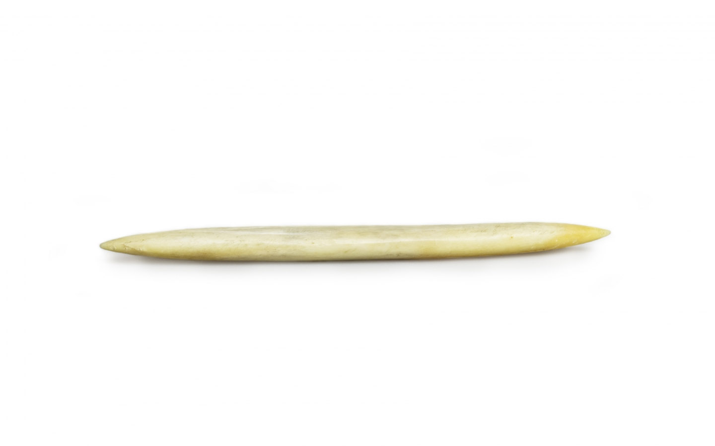 Azagaya bipuntada. Elemento óseo típico de conjuntos característicos del Paleolítico Superior. Dimensiones: 17 cm. de longitud, 1'8 cm. de anchura y 0'5 cm. de grosor.