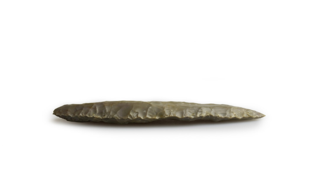 Punta en forma de hoja de laurel. Foliáceo bifacial obtenido mediante retoque en peladura. Forma típica en conjuntos industriales del Paleolítico Superior Medio. Sílex de color bedge con 13'6 cm. de longitud, 3'4 cm. de anchura máxima y 1'5 cm. de grosor máximo.