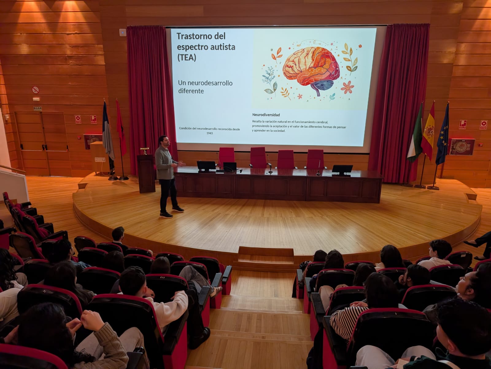 Las actividades han comenzado con la charla  “El cerebro diverso: lo que la ciencia nos enseña sobre el autismo”, impartida por el neurocientífico Manuel López Aranda (Dpto. Biología Celular, Genética y Fisiología), que ha introducido a los asistentes en el complejo mundo de la investigación sobre el cerebro abordando cuestiones clave sobre el autismo: “No es una enfermedad, es un neurodesarrollo diferente”. En este sentido, López Aranda ha incidido en que “ser diferente no significa ser peor: un cerebro autista ve el mundo diferente”.