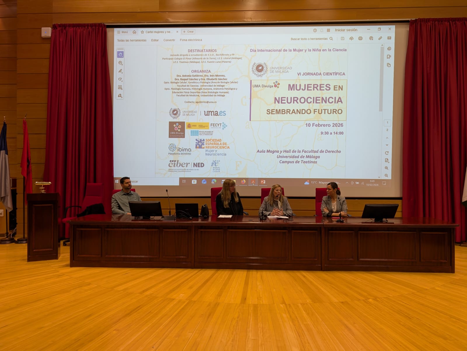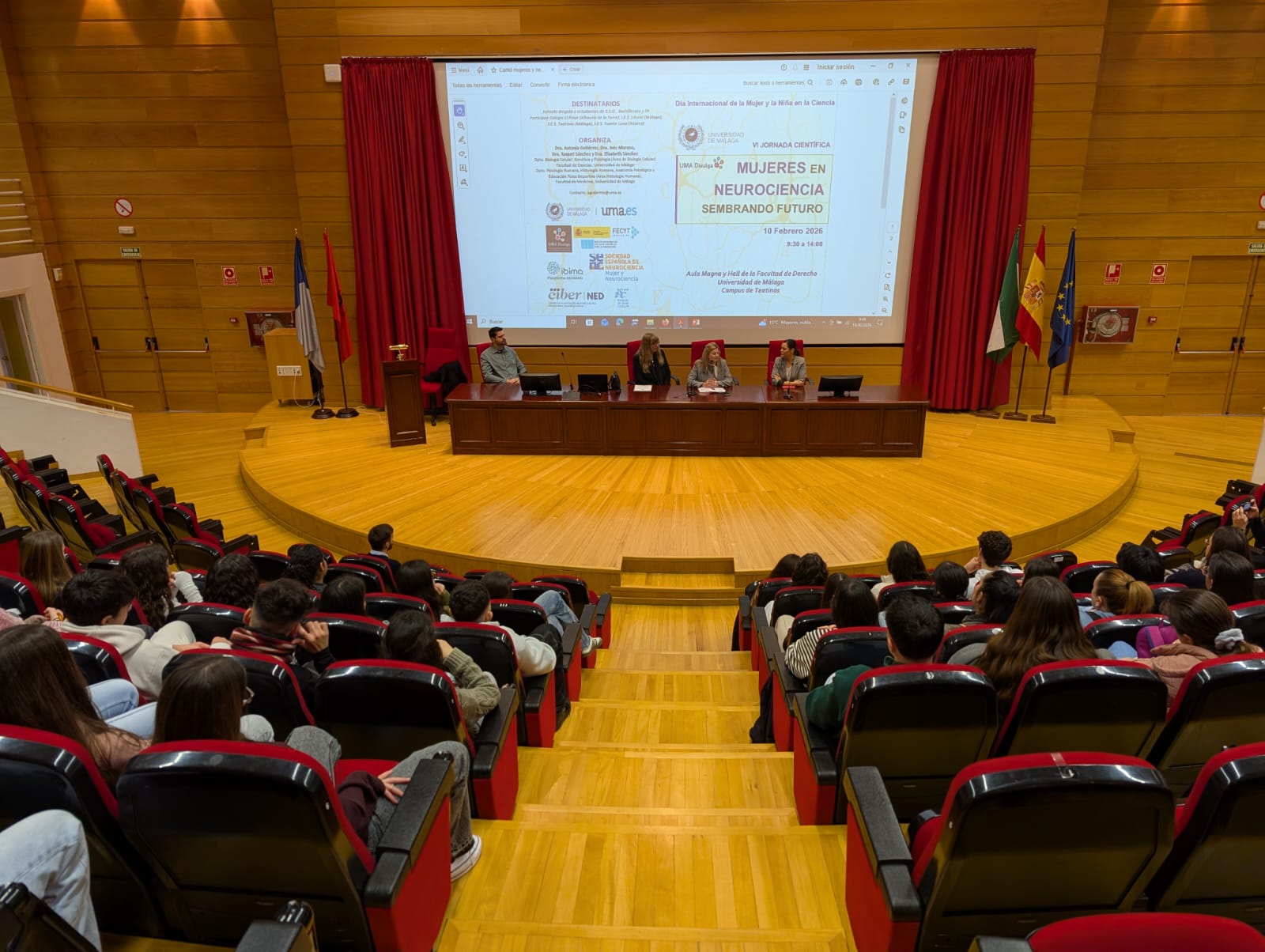 Una nueva edición de la Jornada Científica ‘Mujeres en neurociencia: sembrando futuro’ se ha celebrado esta mañana en la Facultad de Derecho de la Universidad de Málaga con la participación de una treintena de científicas/os y la asistencia de un centenar de estudiantes de formación profesional, secundaria y bachillerato procedentes de cuatro centros educativos de la provincia de Málaga: Colegio El Pinar (Alhaurín de la Torre), I.E.S. Litoral (Málaga), I.E.S. Teatinos (Málaga) e I.E.S. Fuente Luna (Pizarra). La actividad, organizada con motivo de la programación del Día Internacional de la Mujer y la Niña en la Ciencia, ha estado formada por diversas charlas y una decena de talleres que han permitido acercar la neurociencia a los más jóvenes, incentivar las vocaciones científicas y visibilizar el papel de nuestras investigadoras.